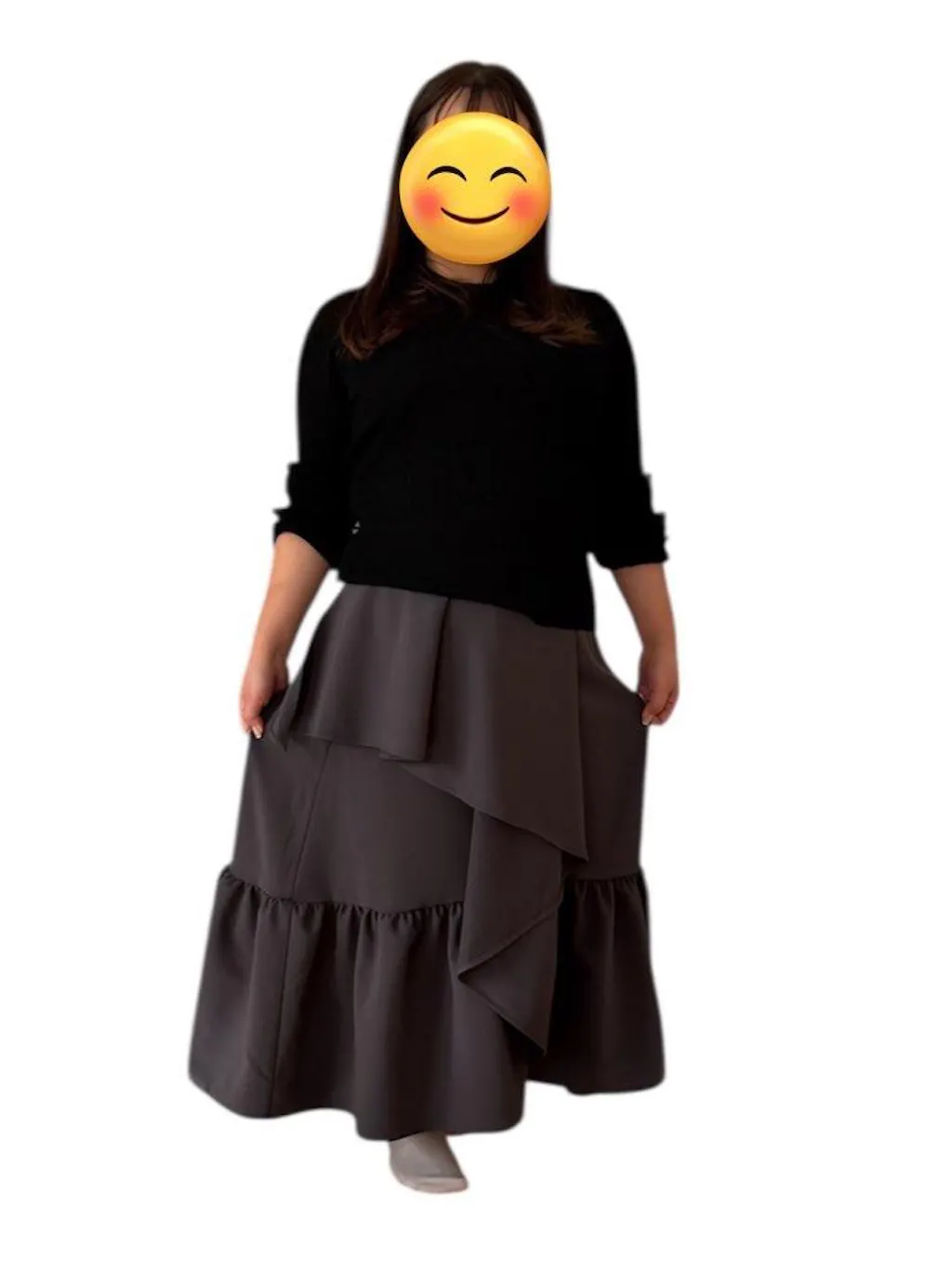 ラッフル系のスカートは下半身デブなわたしには太見えしがちなのですが、形が優秀すぎて着た瞬間飛び回りました。フレアの揺れ度合いも一生くるくるしていたいくらい素敵です。ぽっこりお腹も生地のお陰で目立たない!生地がしっかりしていて程よい重みがあり個人的にはとっても安心感のあるスカートです。ポケット付きなのも最高…毎日着たいです。ティールブルーも買ってしまおうかな… モノトーン系やモード系の服が多いためチャコールを選んだのですがこれまた合わせやすくてOverEさんに足を向けて寝られないです。