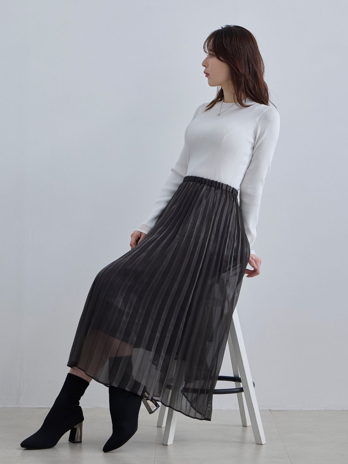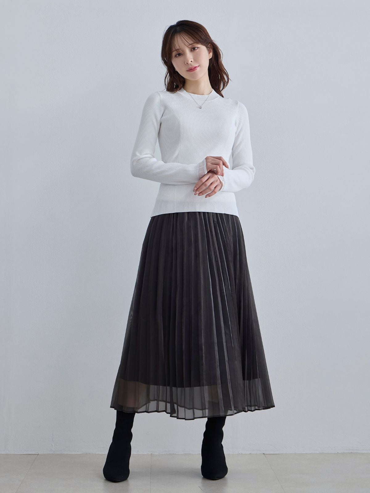 袖口シアーパネルニット:ブラック