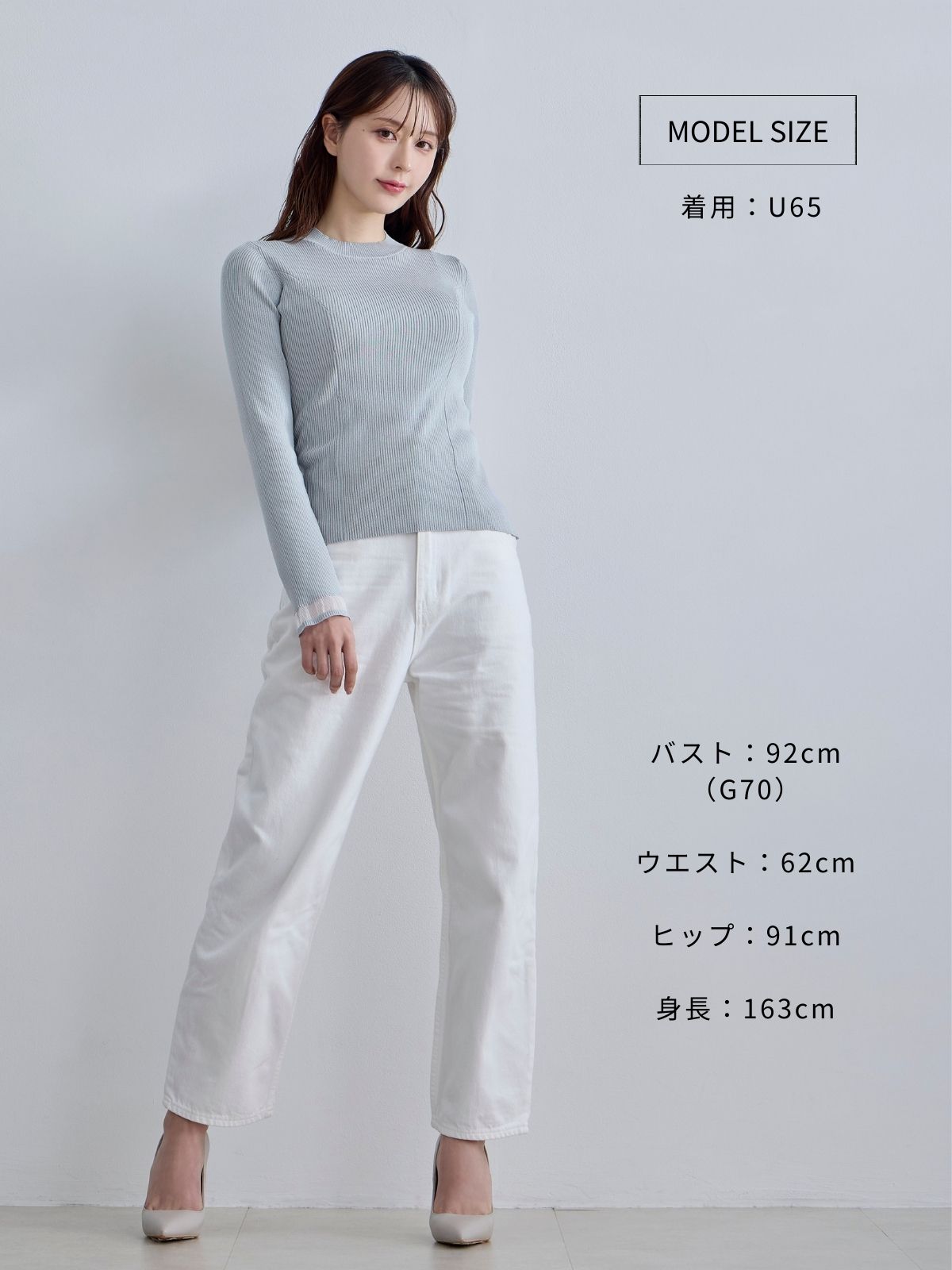 ずっと購入を迷っていたのですが、セールに後押しされてイロチ買いしました! U65サイズを購入、普段ブラはG65をつけることが多いです。 骨ストなのでドロップショルダー気味なところが心配でしたが気にならず、白のやや透け感あるところも、タイがボリューミーなので意外とインナーとか気にならずに着用出来ました。 いつもウエスト周りの生地が余りまくりINする時ぐちゃぐちゃになって嫌なのですが、こちらはスッキリしていてシャツがたるみすきず良かったです。 また、カーディガンや前ボタンブラウスはどうしても胸周りがパツパツした感じになってインナーが見えたりして嫌なことが多かったですが、こちらは胸周りにゆとりがあり(余るかもとも思ってましたがそれも気にならず)ありがたいです。
