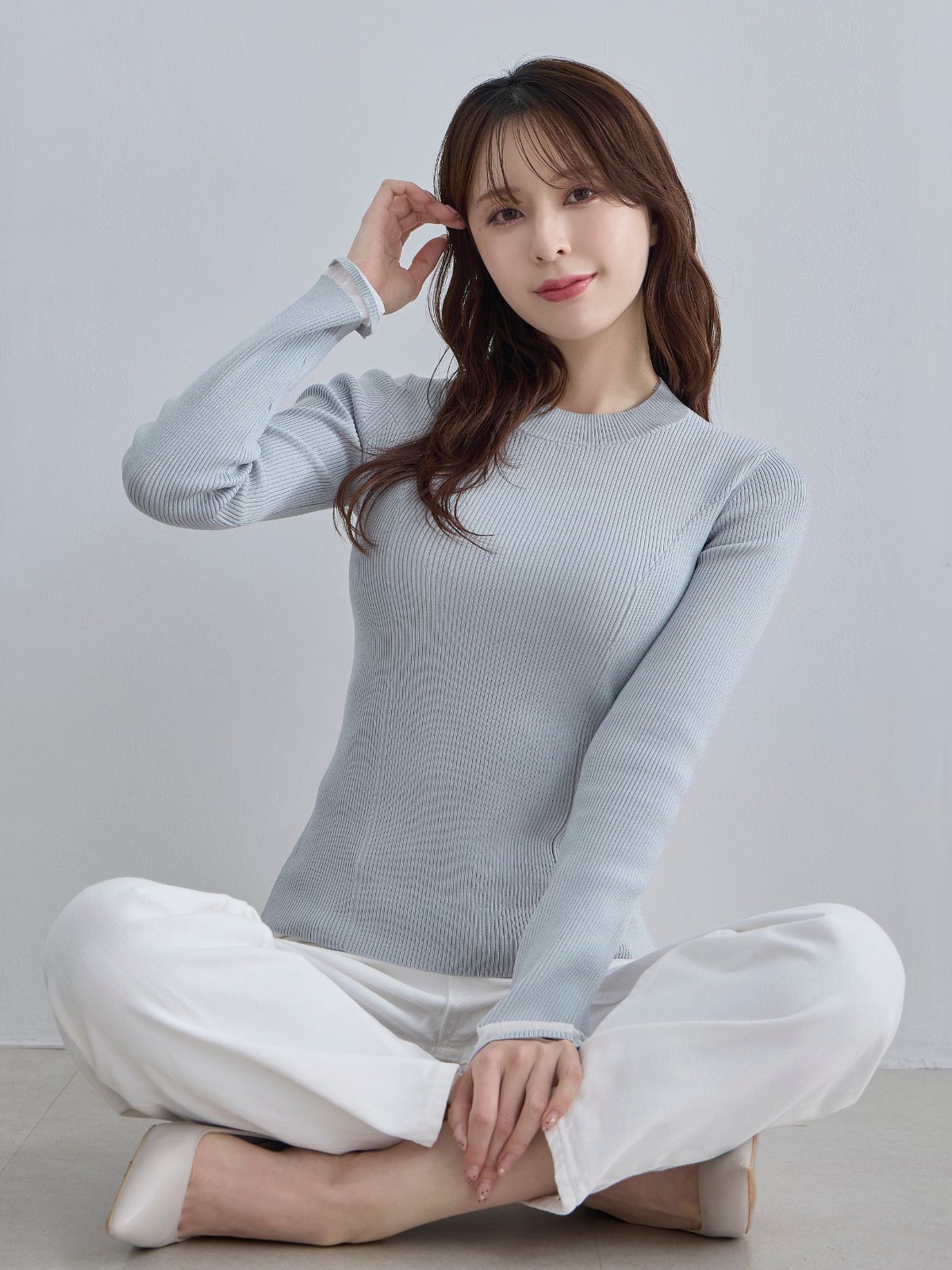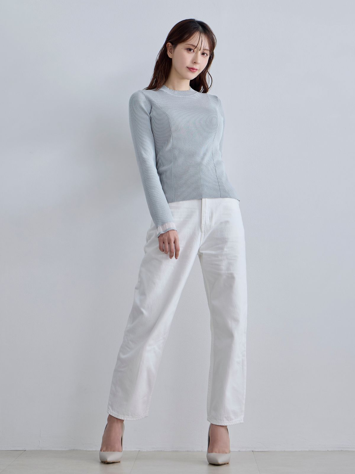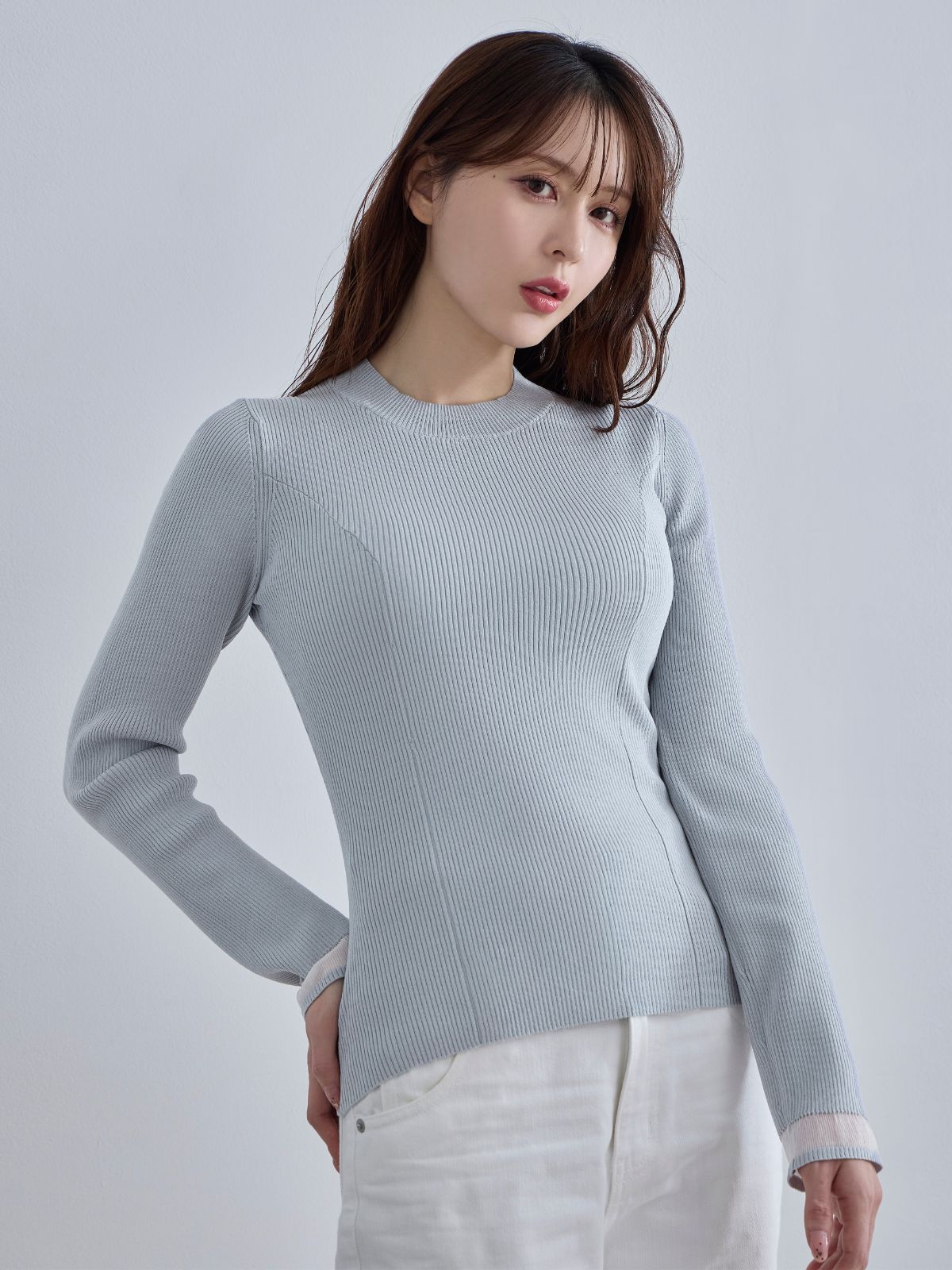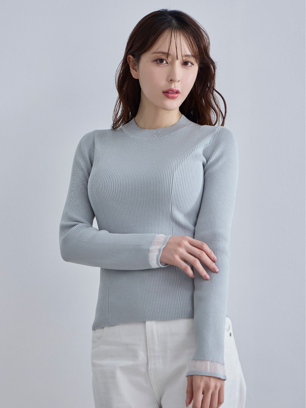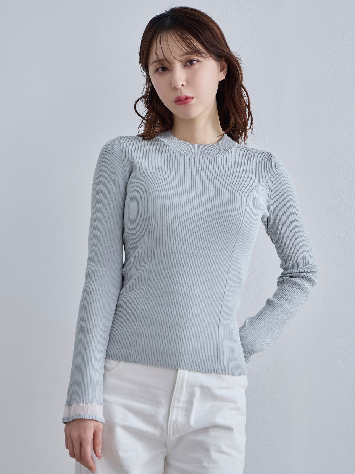 袖口シアーパネルニット:ホワイト