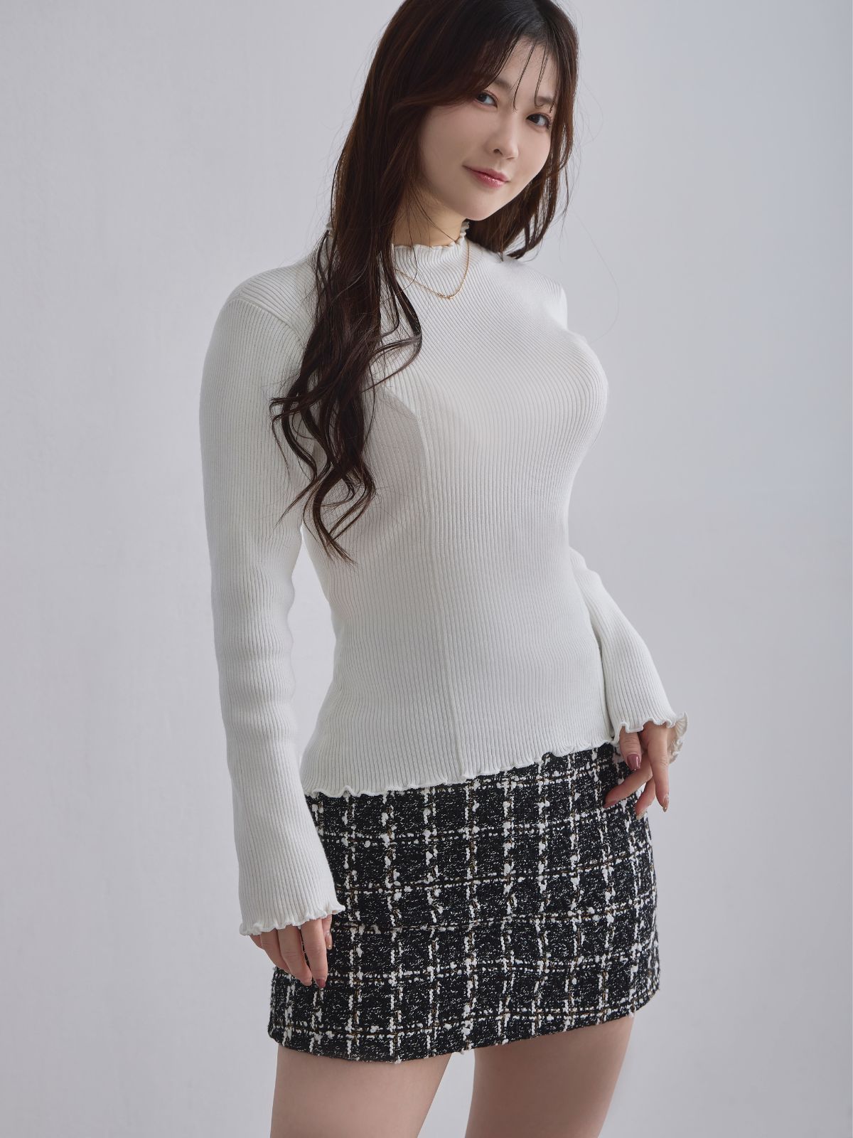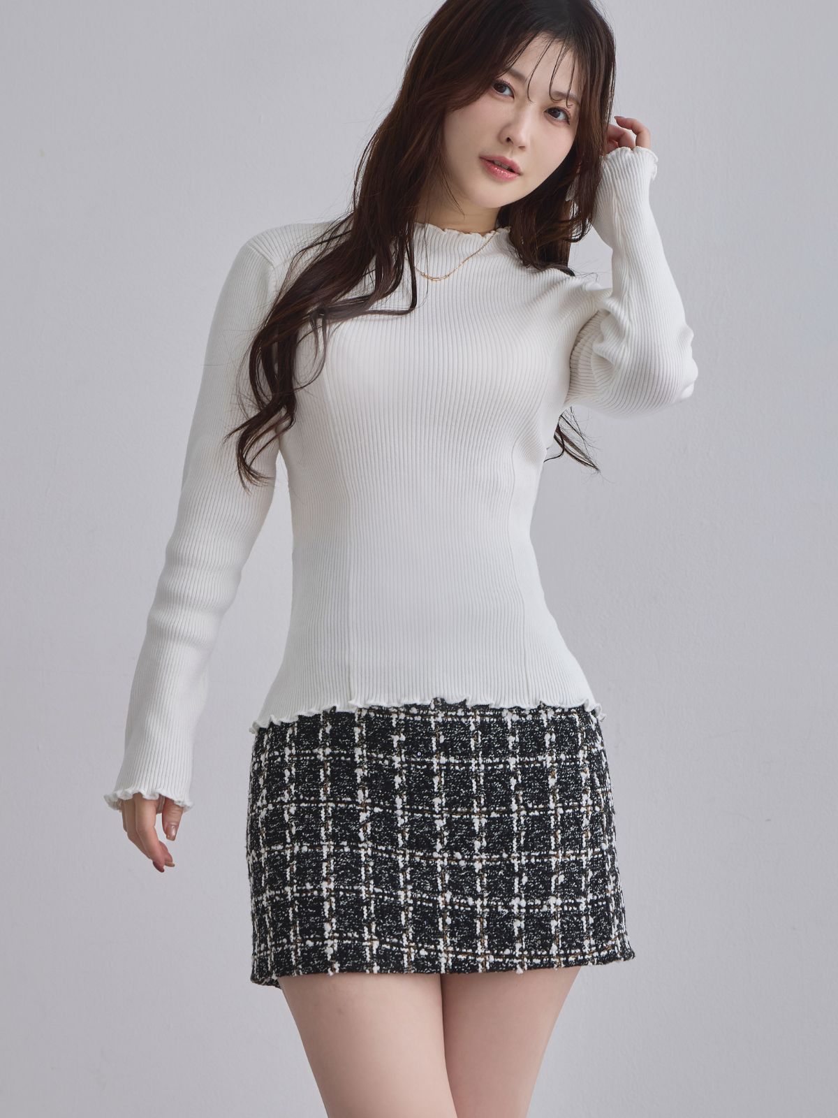 ニットは肩幅の関係でいつもよりワンサイズ下げて購入しているので今回もワンサイズ下げてお迎えしました。 少し幅広く深すぎないVネックは鎖骨周りを綺麗に、またお辞儀をしても胸元が気になりません。 なにより丸顔でも似合うVネックだなと思います。 全体のラインも肉感を拾いにくいので自分が気になっている骨盤の左右差からのラインの崩れが気になりません。 ダークモカの色味も暗すぎず、明るすぎずどのパーソナルカラーも着られるモカだと思いました。