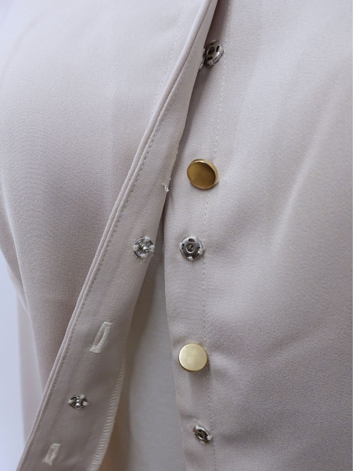 微ストレッチのため、基本は胸囲を基準とした通常サイズ、サイズ境界線の方は小さい方をおすすめします。推奨胸囲+3cmまで着用可能です。※2019年発売の前開きブラウスは推奨胸囲内のご案内でしたが、2020年から前立てが浮きにくいよう改良の上、変更しております。