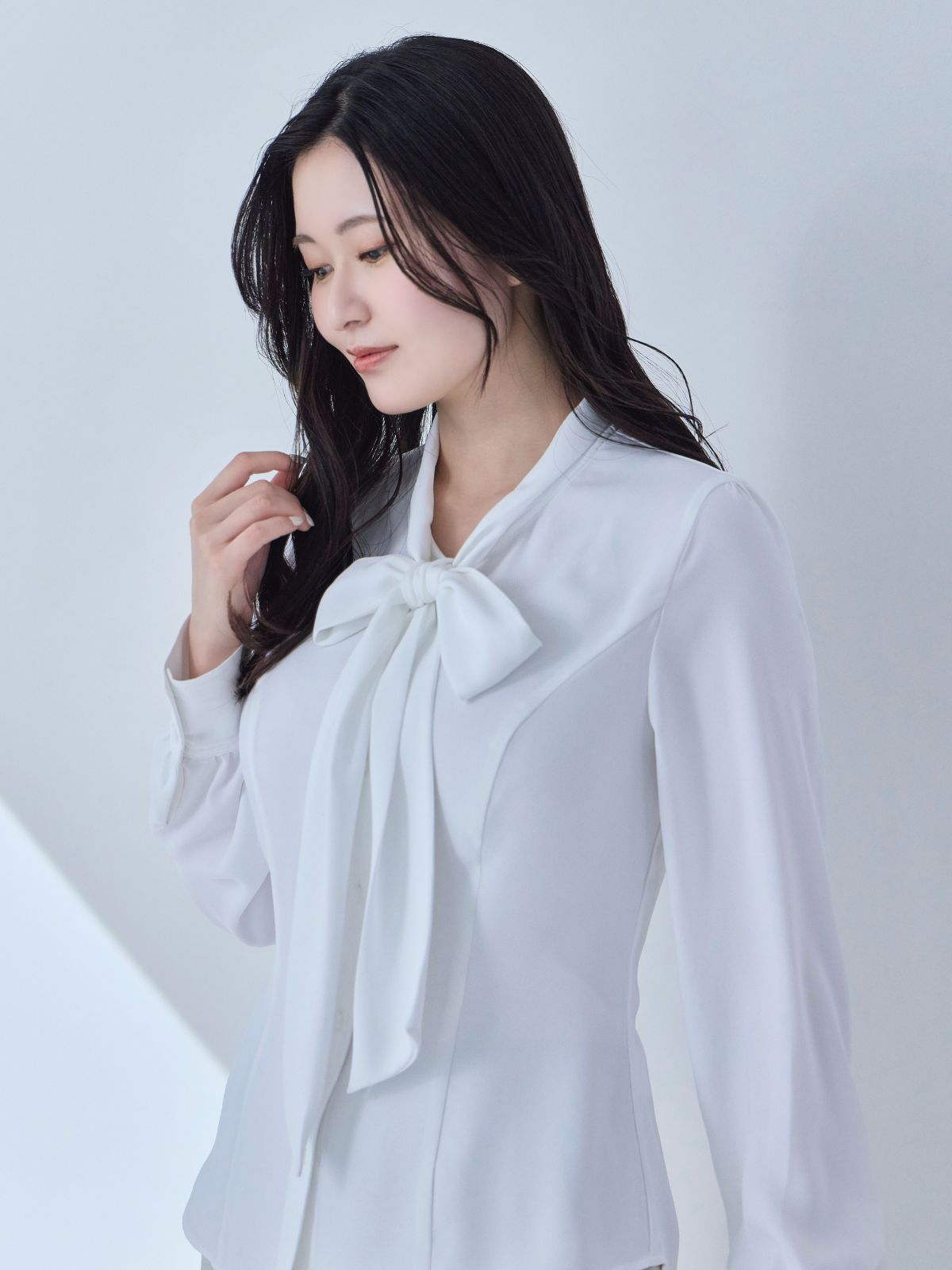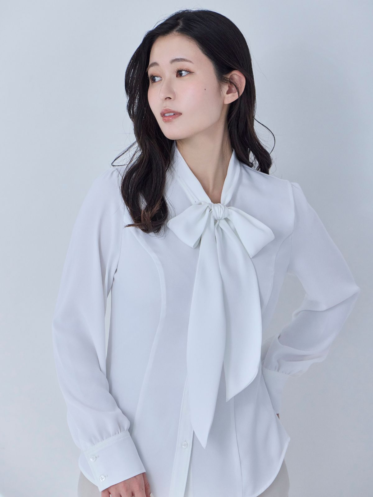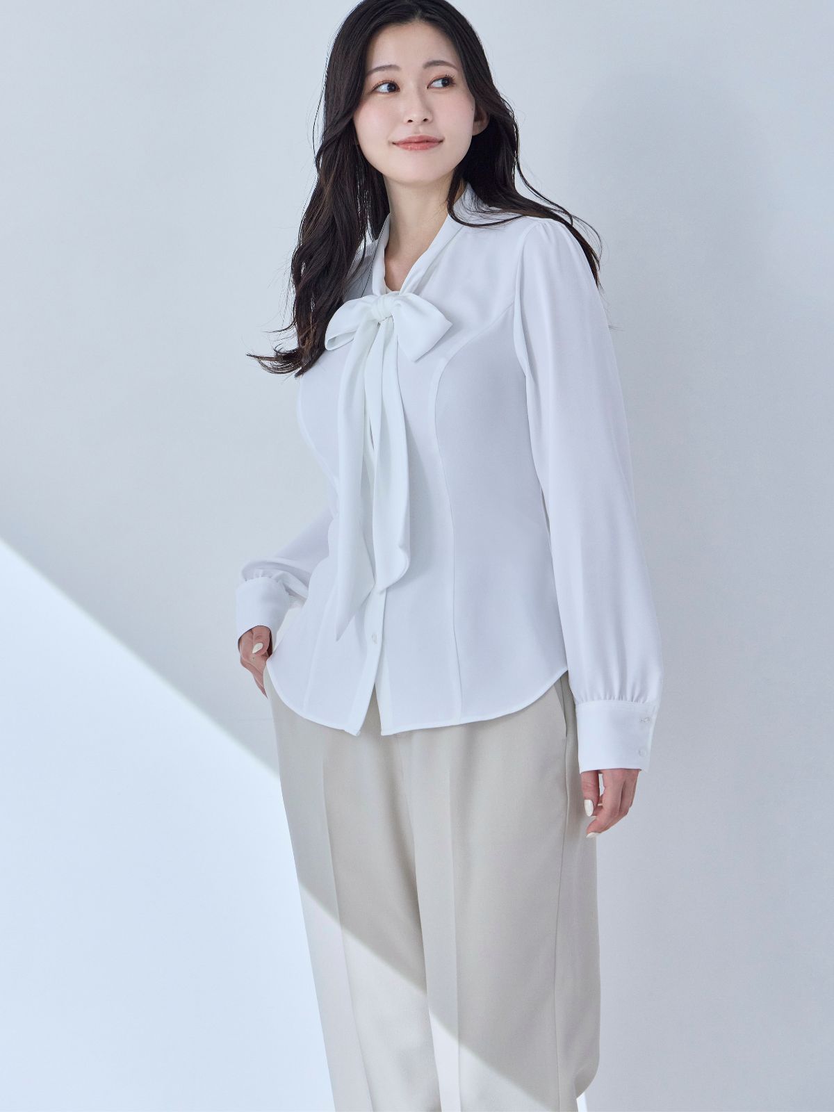 透けづらいフレンチボウタイブラウス:パウダーブルー