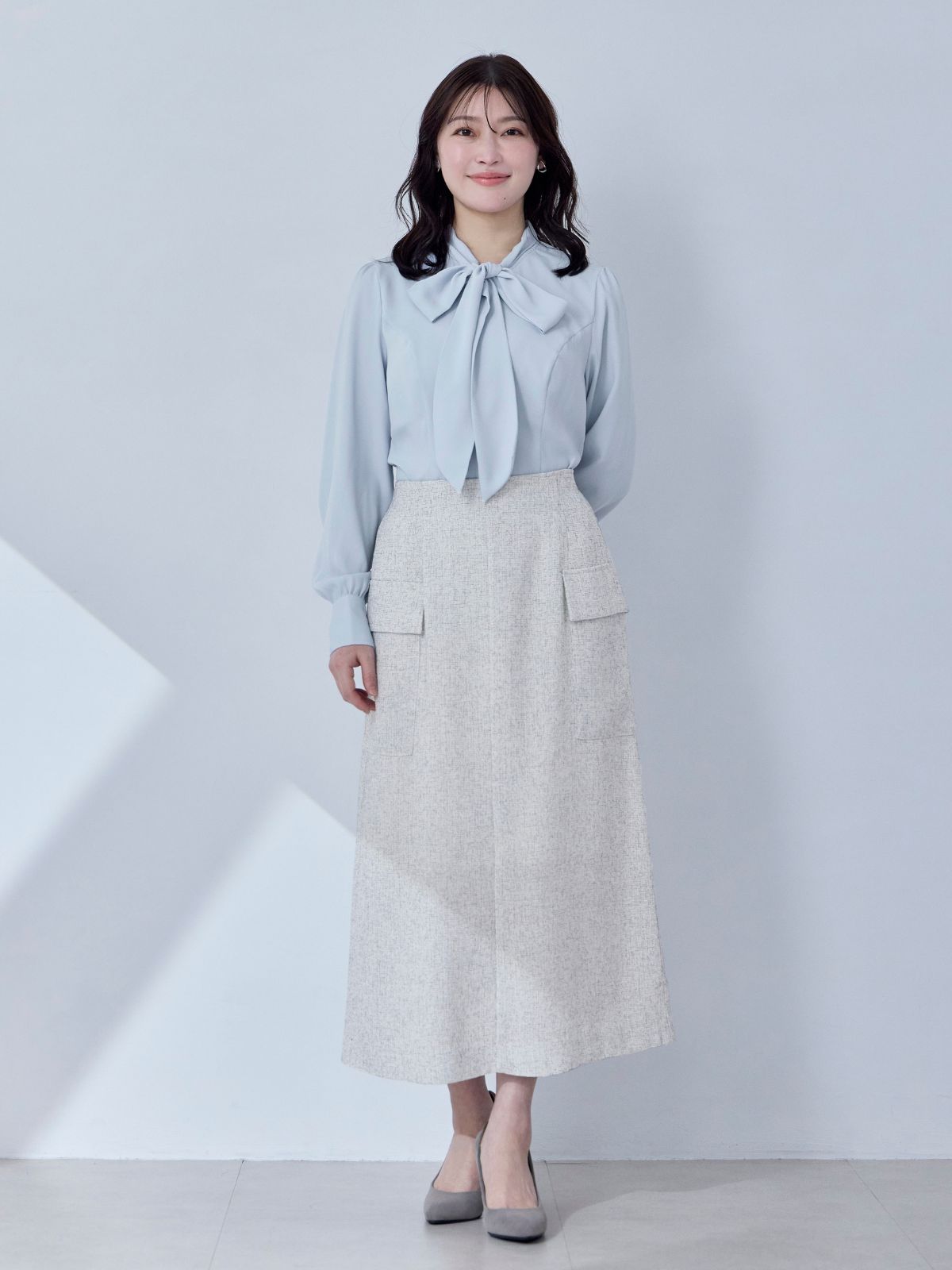 下腹ぽっこりな私もスタイル良く着れる 魔法のスカートです。 まだ寒い時期ですがこれを着ていると 『冬のブルーかわいい!春を先取りだね!』と職場で褒められます。 チャイナパネルニットやVネックストラップ カットソーにもピッタリです!