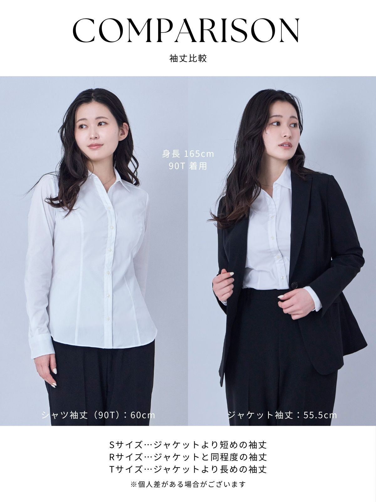 胸囲を基準とした独自のサイズ展開に加え、身長別に着丈・袖の長さをお選びいただけます。推奨胸囲×身長を掛け合わせた8サイズ(U65-S-、U65-R-、90R、90T、96R、96T、102R、102T)からお選びください。微ストレッチ素材のため、サイズ境界線の方は小さい方をお選びください。推奨胸囲+3cmまで着用可能です。