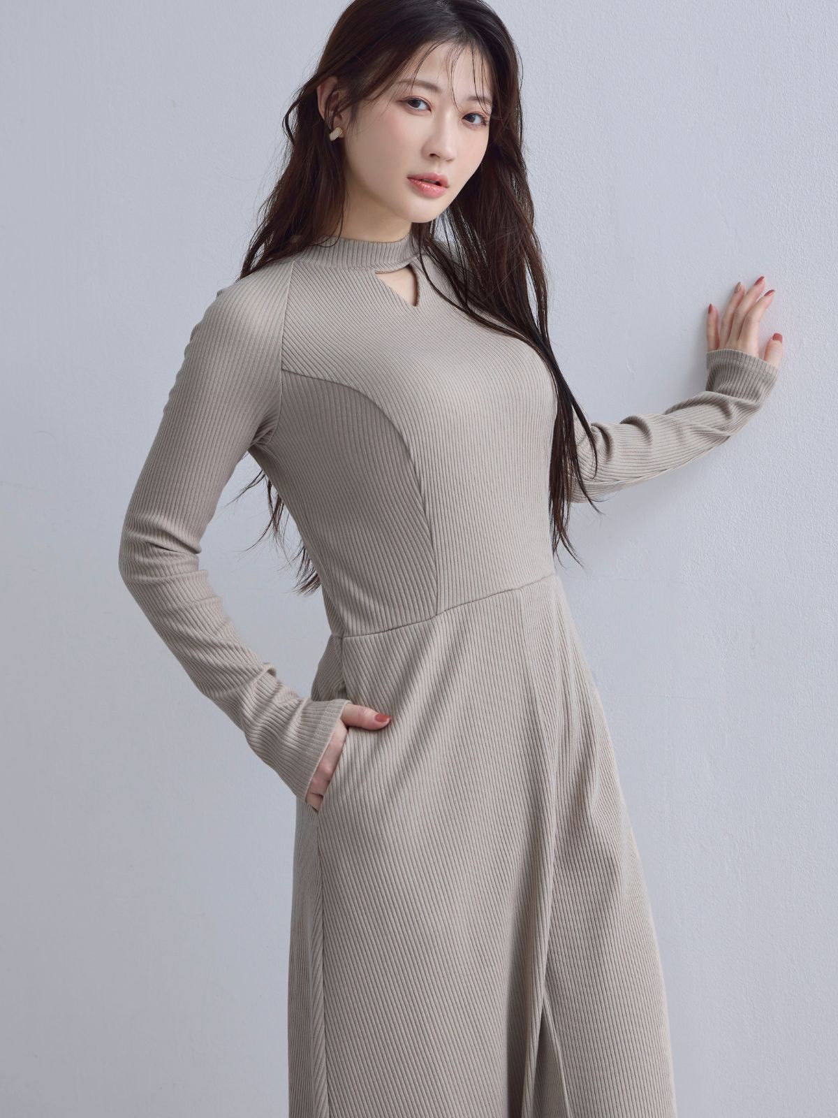キーネックリブカットワンピース:ブラック