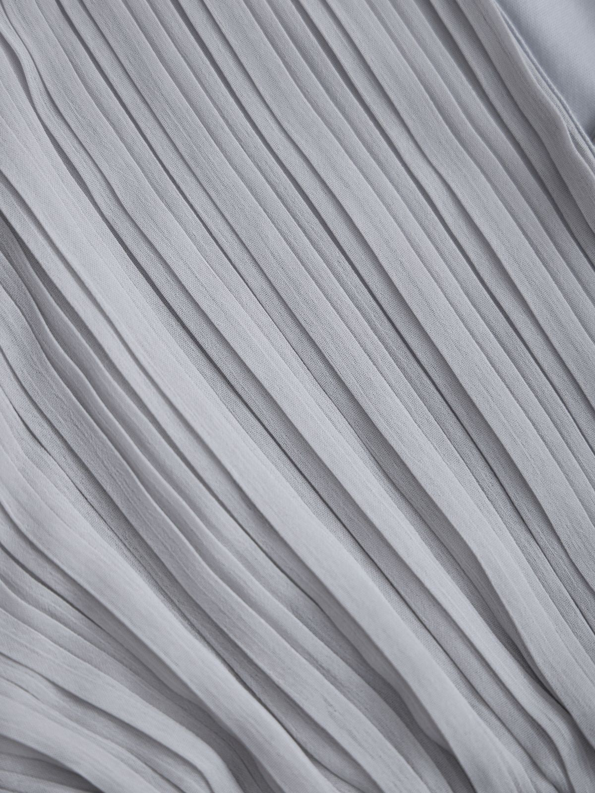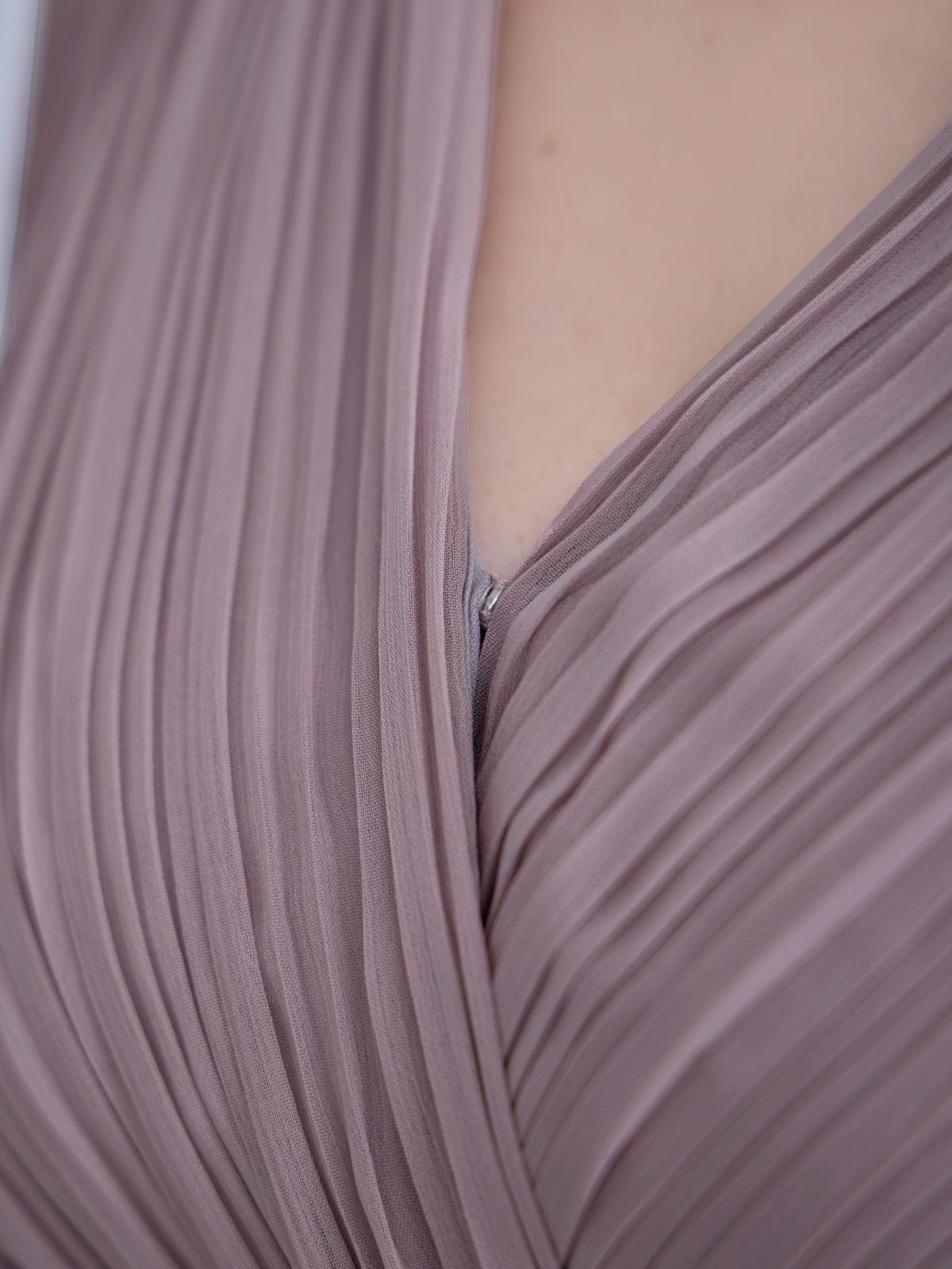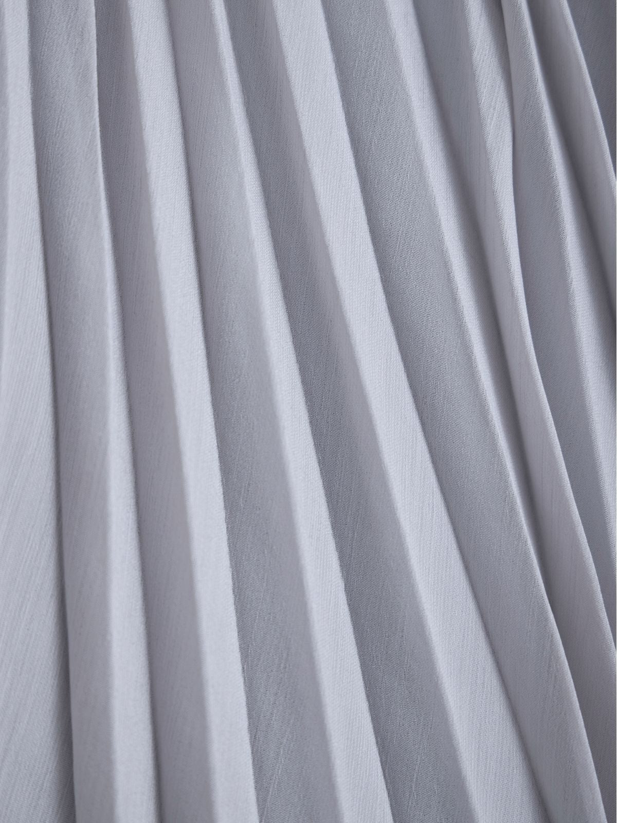 軽やかで表情のある楊柳シフォン素材に身頃と袖は細かいボックスプリーツ、ボトムスはアコーディオンプリーツでより表情豊かに仕上げております。