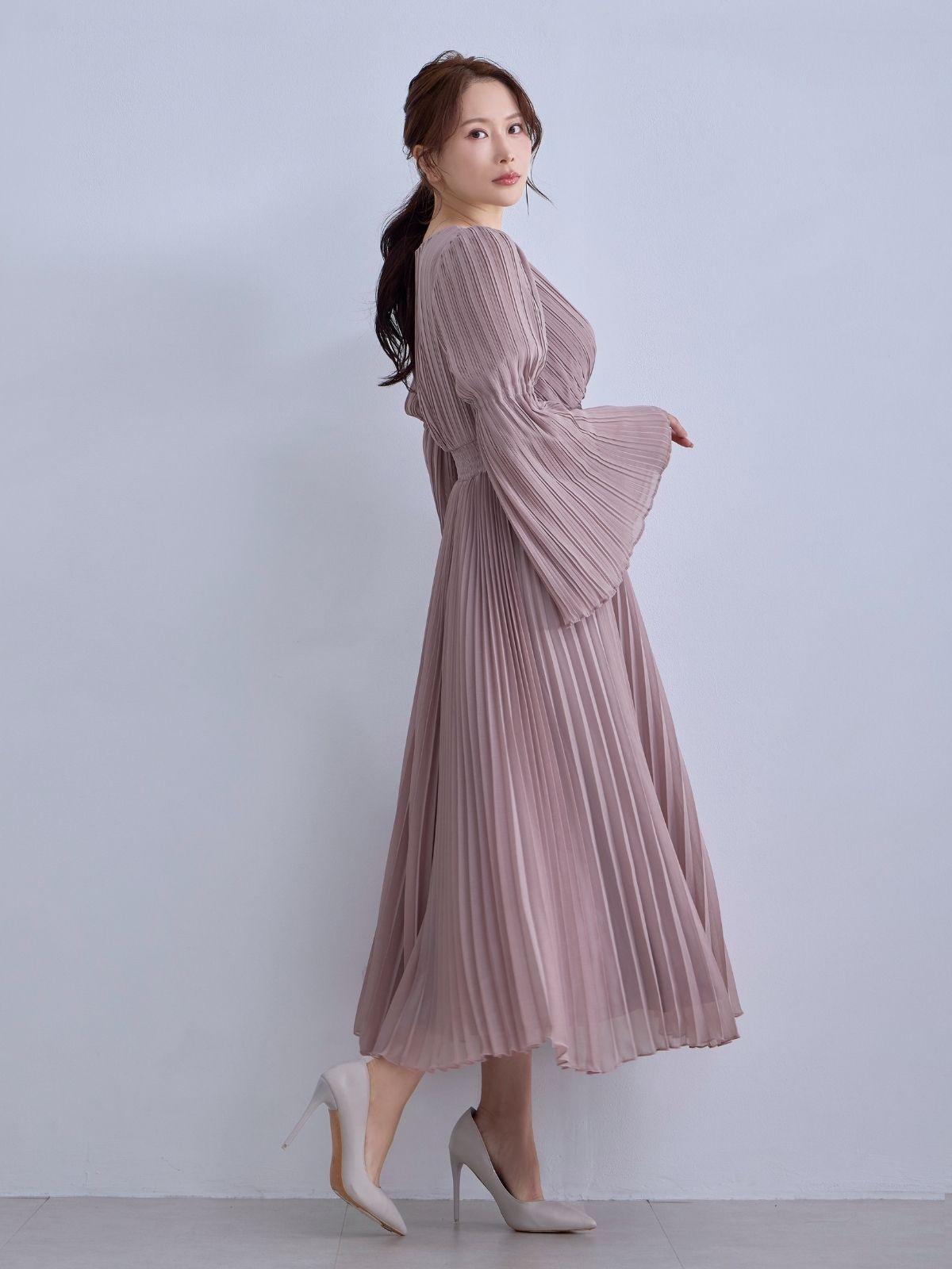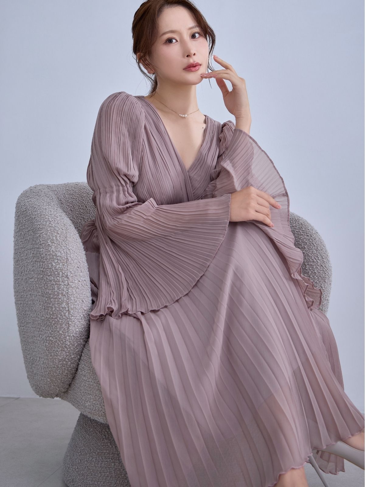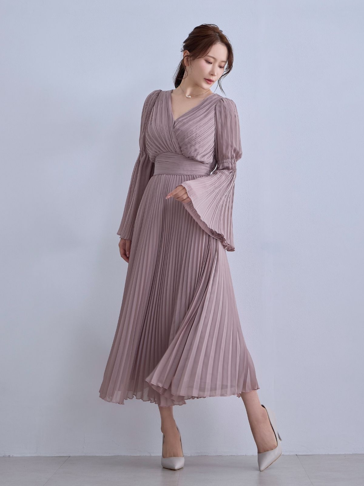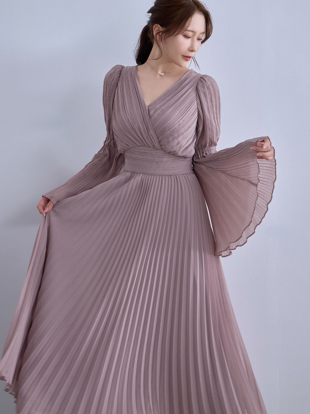 overE’s HOLIDAY ベルスリーブプリーツドレス:ライトグレー
