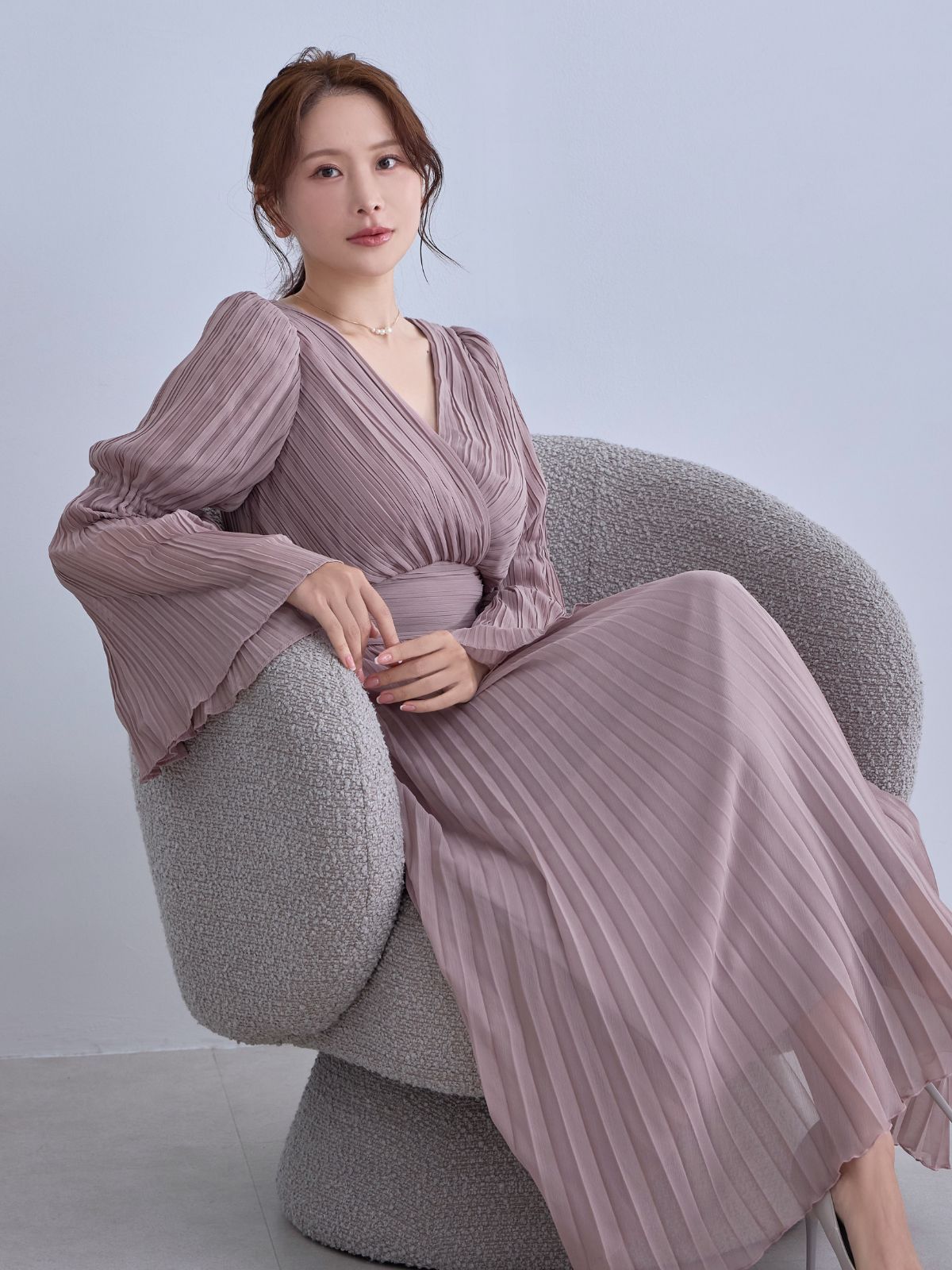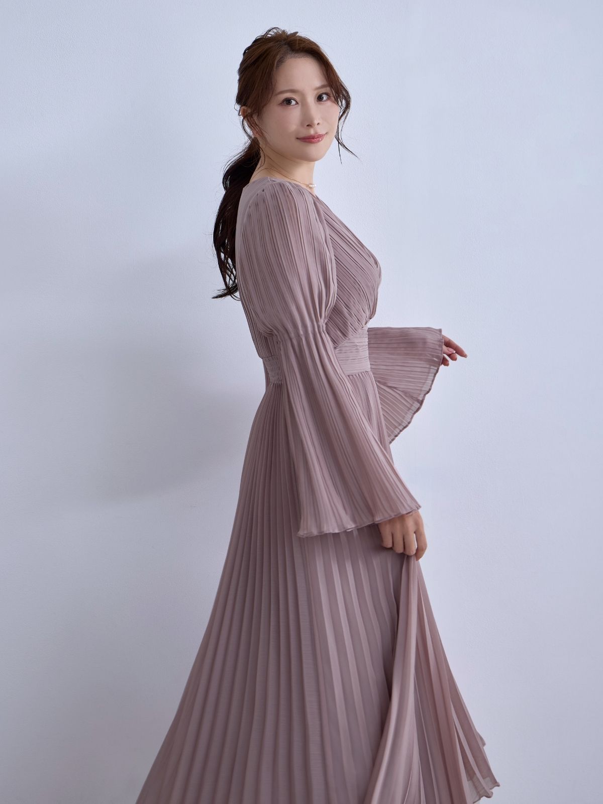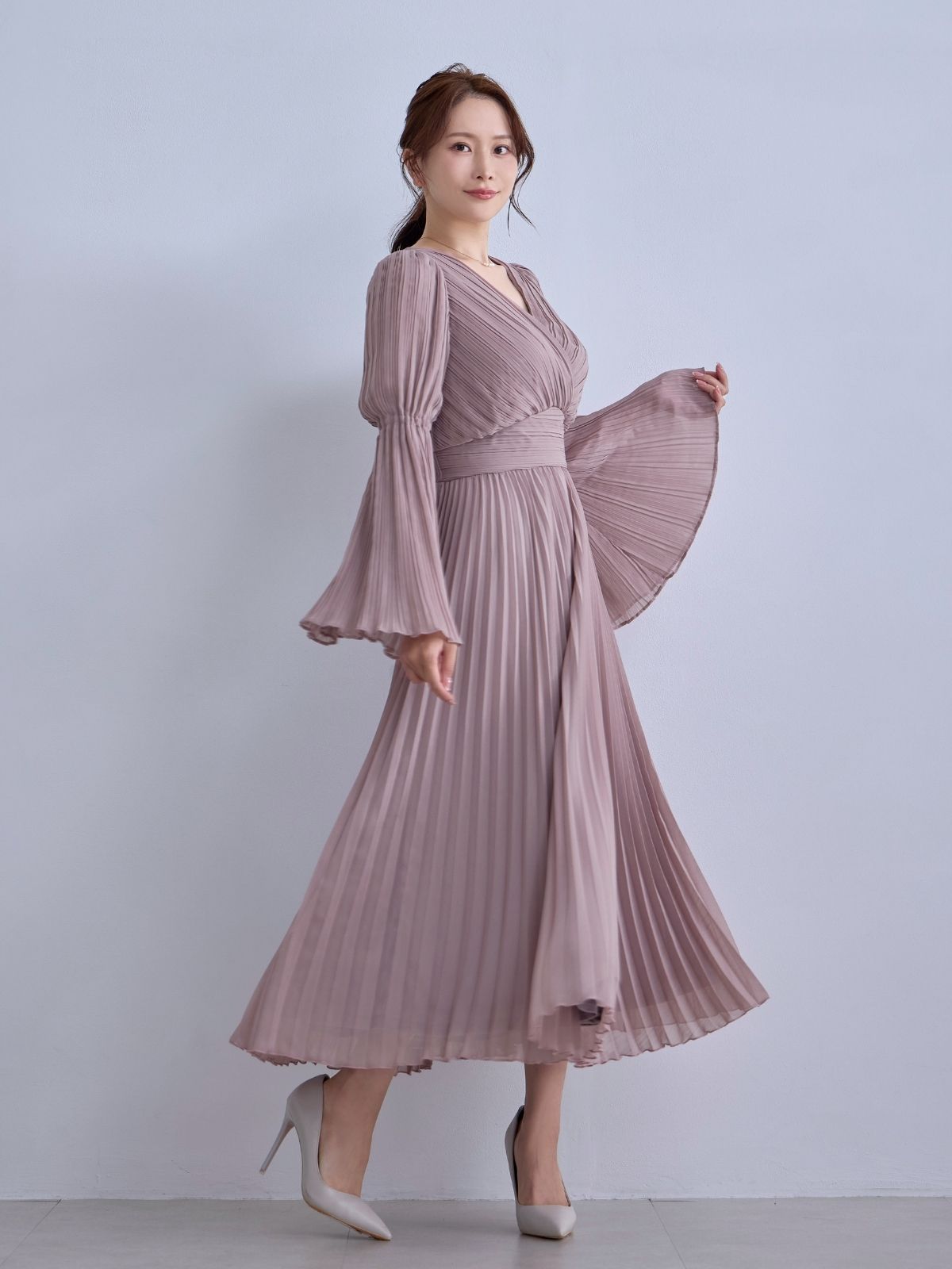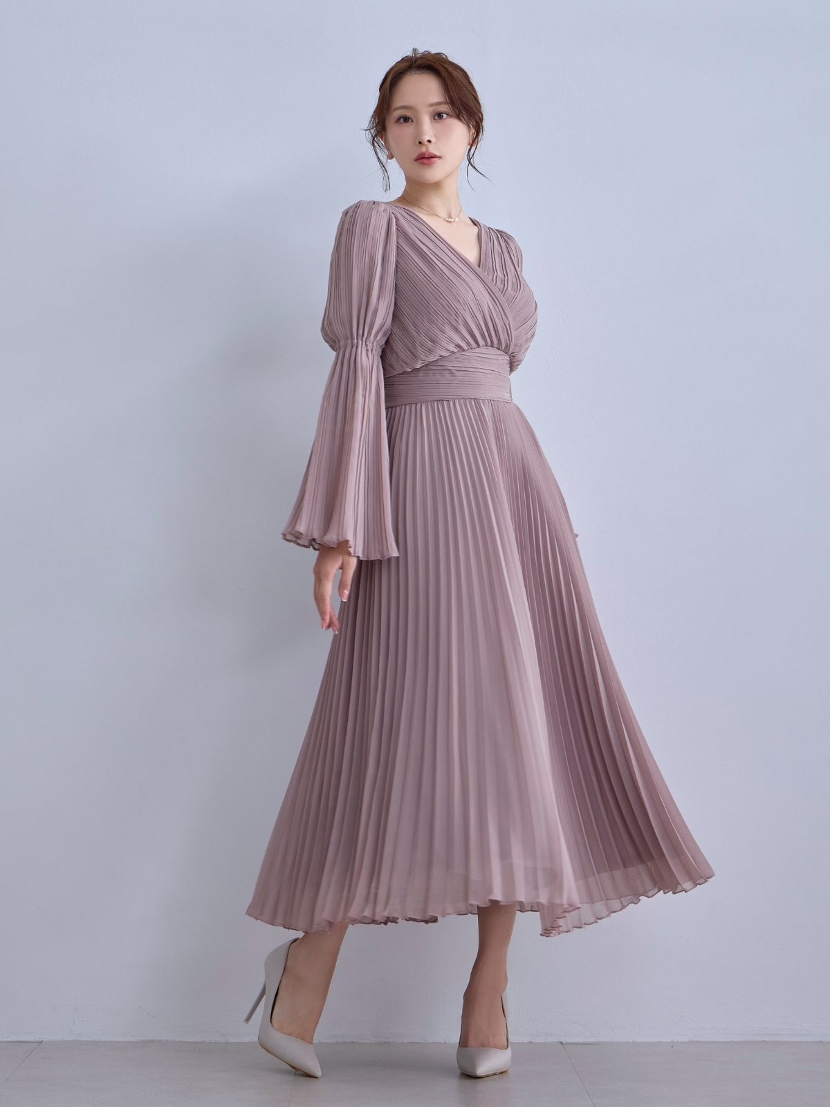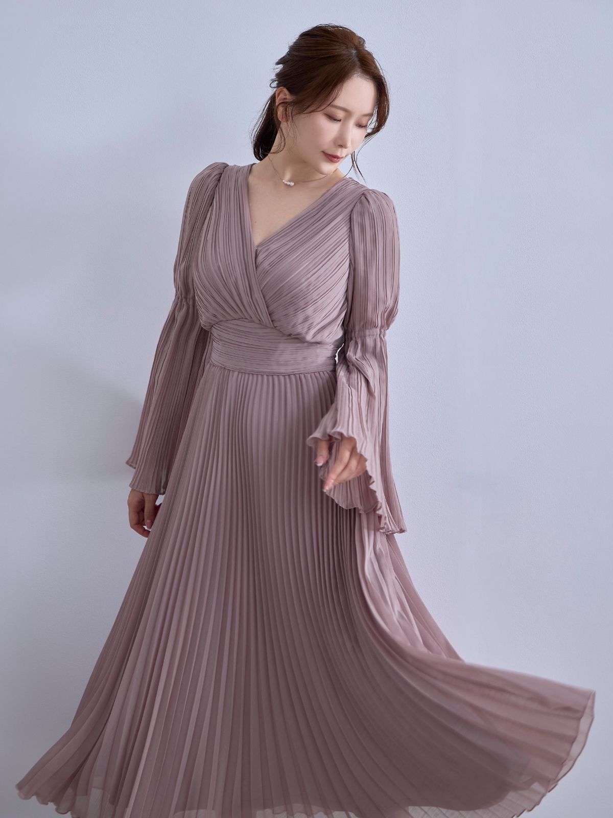 overE’s HOLIDAY ベルスリーブプリーツドレス:ライトグレー