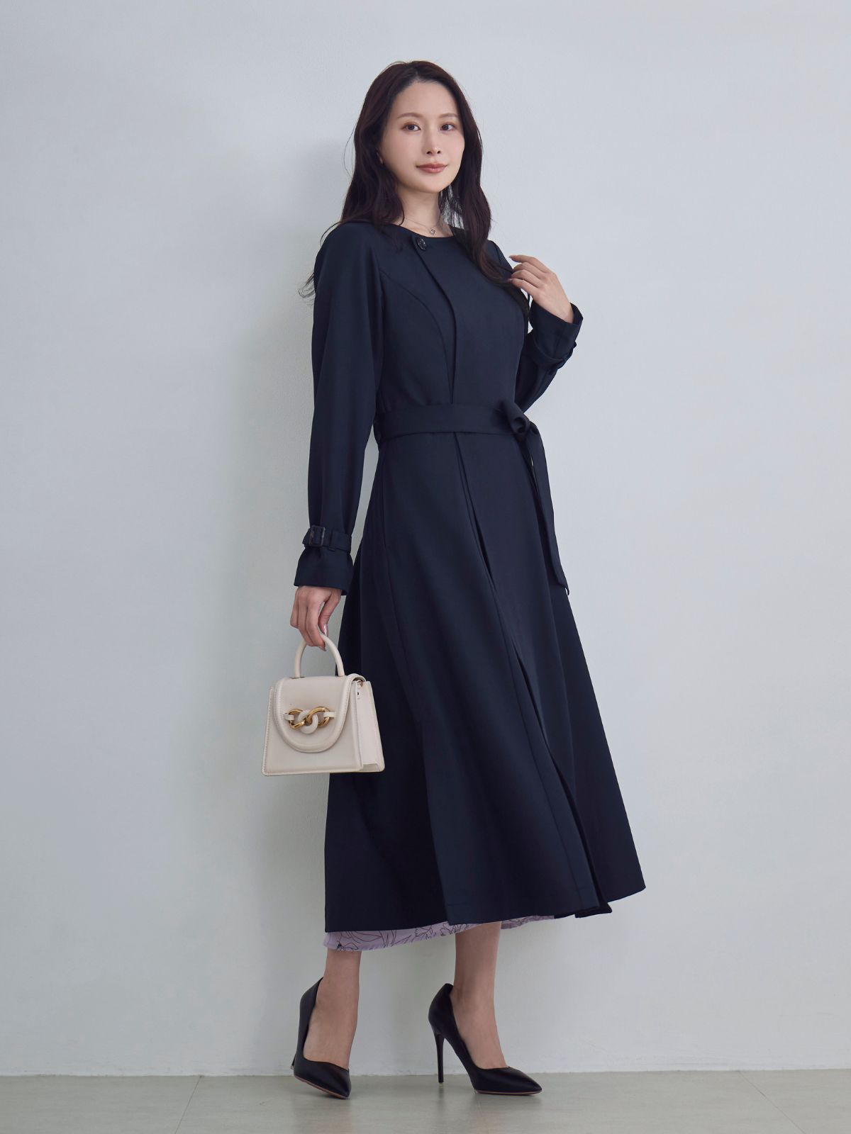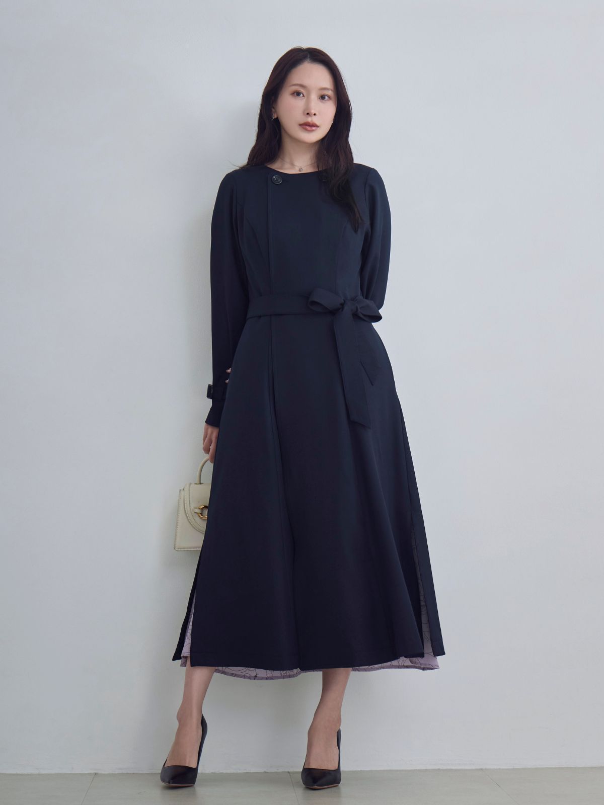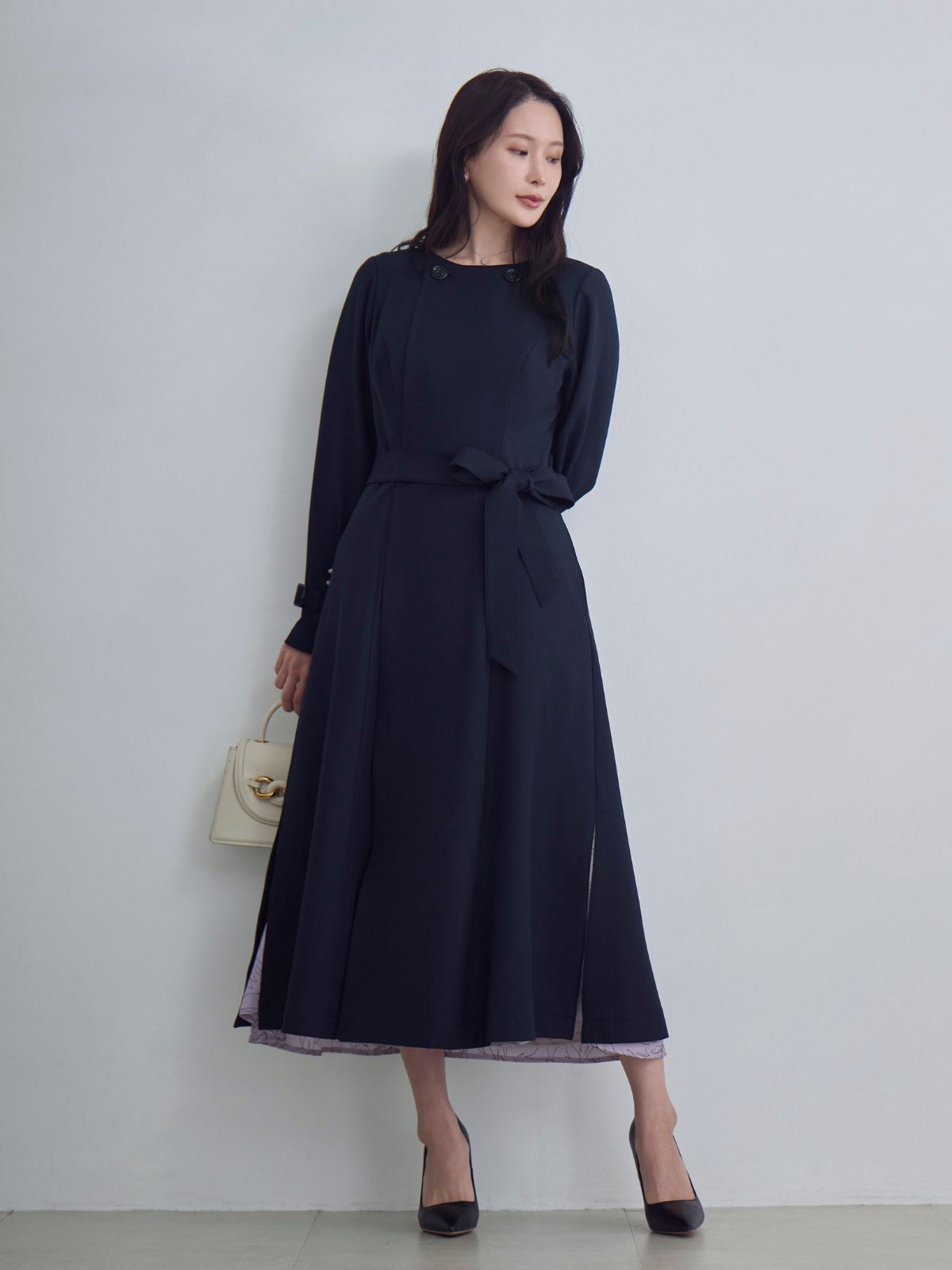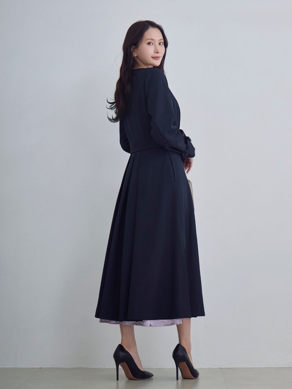 ノーマークでしたが、ポップアップで見て試着すると、動くたびにキラキラして可愛い! でも落ち着いたスモーキーなブルーなので派手すぎずに職場でも着れます。 よく体にフィットして、ウエストほキュッと細見えしますが、着心地はとても柔らかくて気持ちいいです。