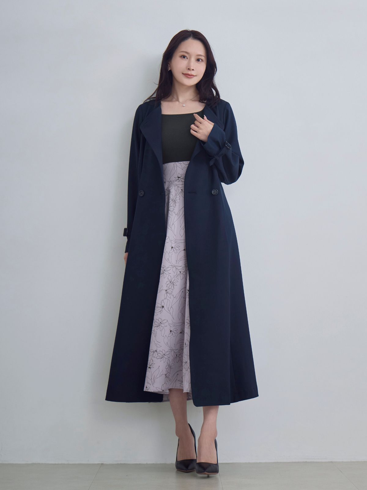ポップアップの実物を見たとき、まずこのお色に感動しました! スエード特有の表情にこのブルーグレーがなると、白っぽいところと落ち着いたブルーグレーとで、ドレープ で表情がコロコロ変わり、まるで朝露を受けた紫陽花や、琥珀糖みたいに美しい! 合わせて同じブルーグレーのキラキラニットとワントーンコーデするとオシャレ感MAXです。 通常、ウエストがベルトマークされていないようなスカートはウエストが寸胴気味に見えちゃうので避けてるのですが、こちらはややハイウエスト気味なのか、すっきり見えました。柔らかくてとても着やすい。 全色揃えたいです。