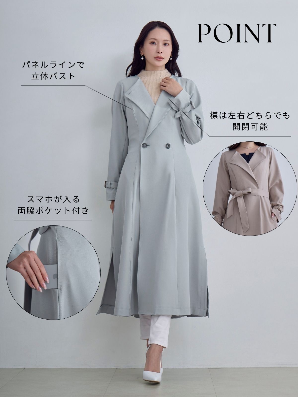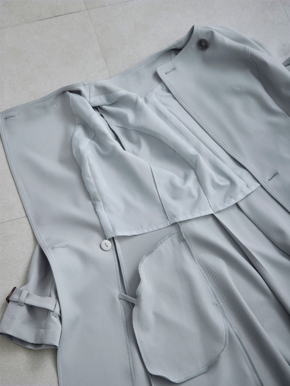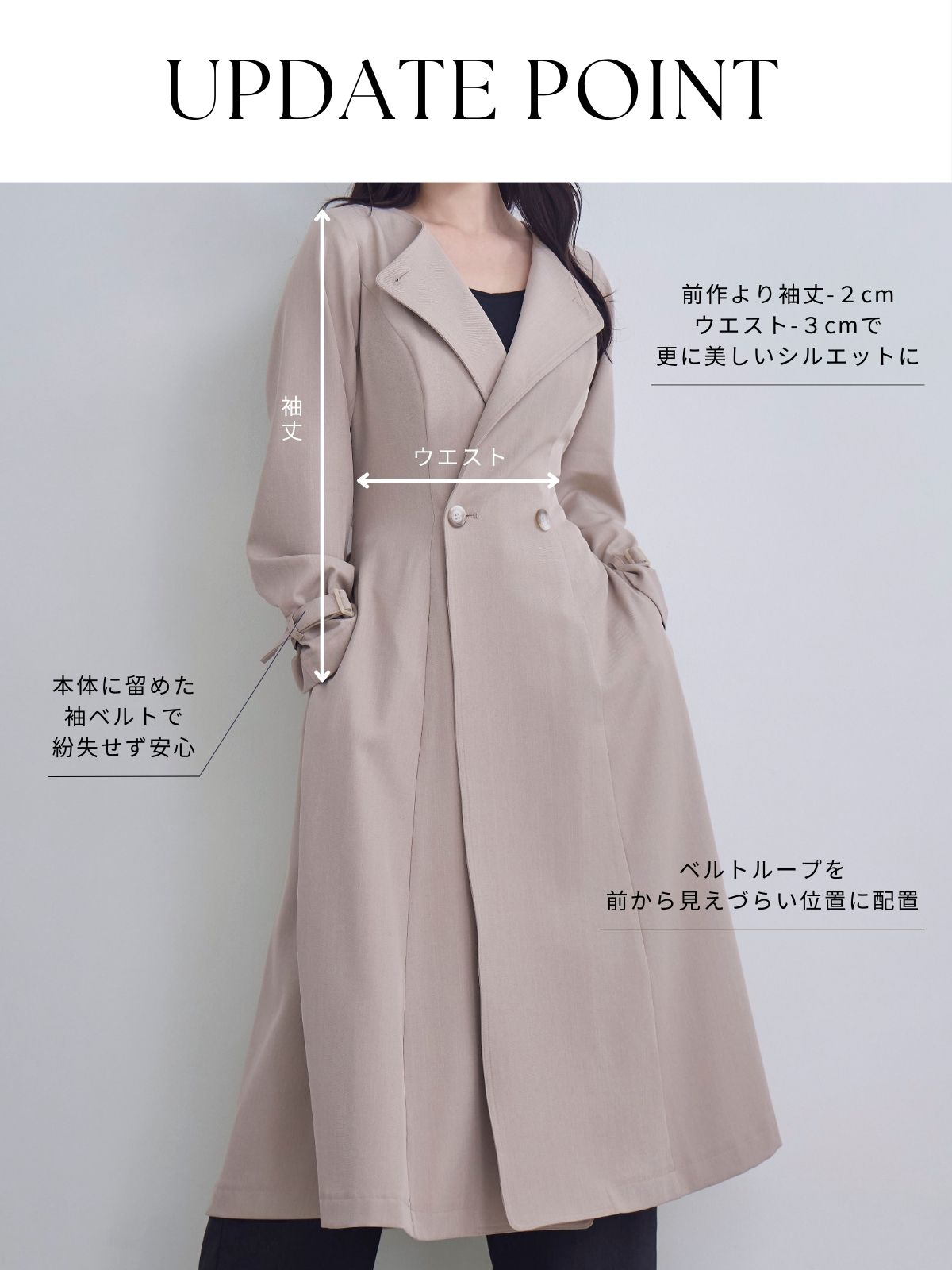 前回好評だった"2wayノーカラートレンチコート"を素材や仕様をアップデートし、新たにお作りしました。パネルラインで美しいシルエットはそのままに、より上品な素材を使用し気品あるコートに。