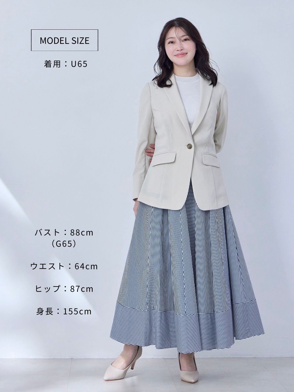 153cm57kg E75です。 以前、試着で試したとおりU65で注文、着用も問題なくラインもとても綺麗です。 コーラスのコンサートの衣装として購入しましたが、今後の子どもの卒入学シーズンにも活躍しそうで今から楽しみです。 子どもからは「フワフワの雲みたいな模様で可愛いね」とお褒めの言葉を貰いました。