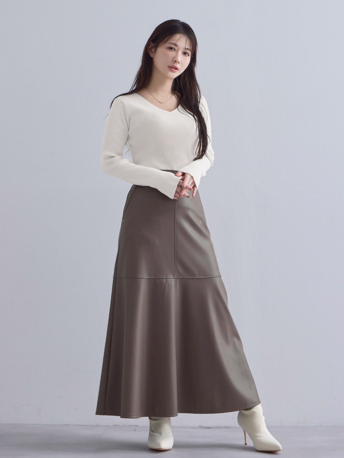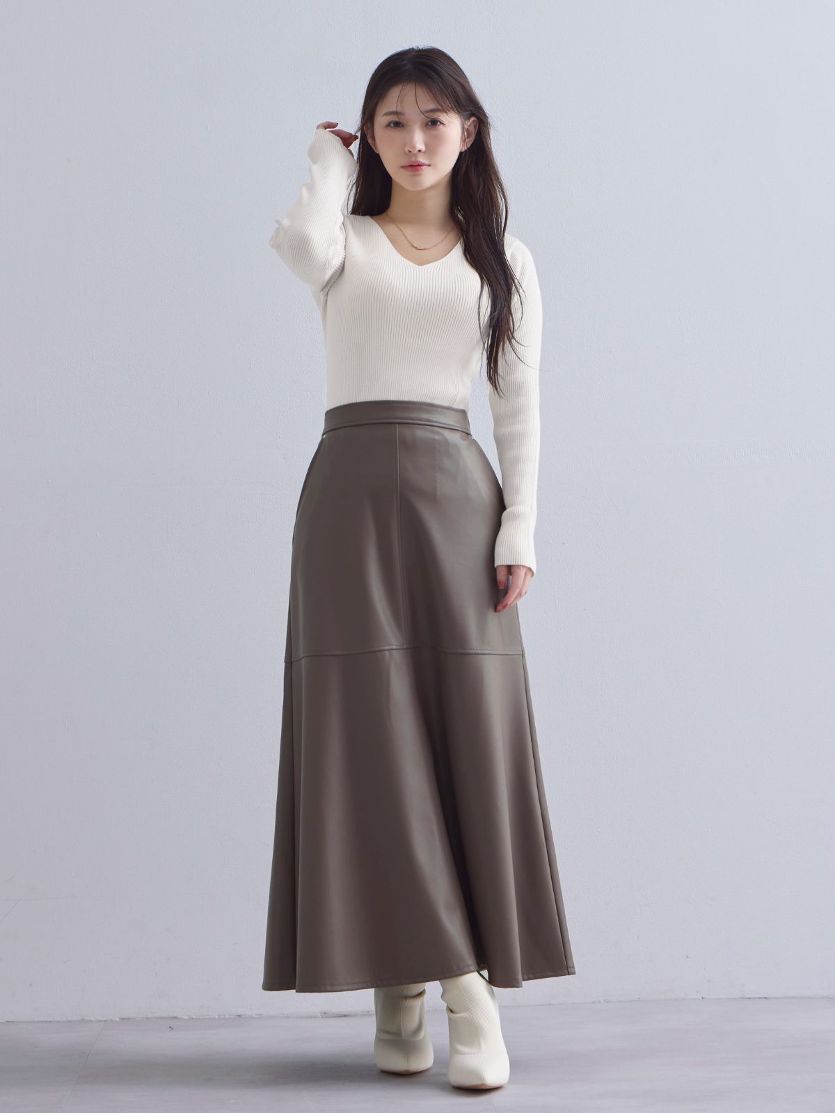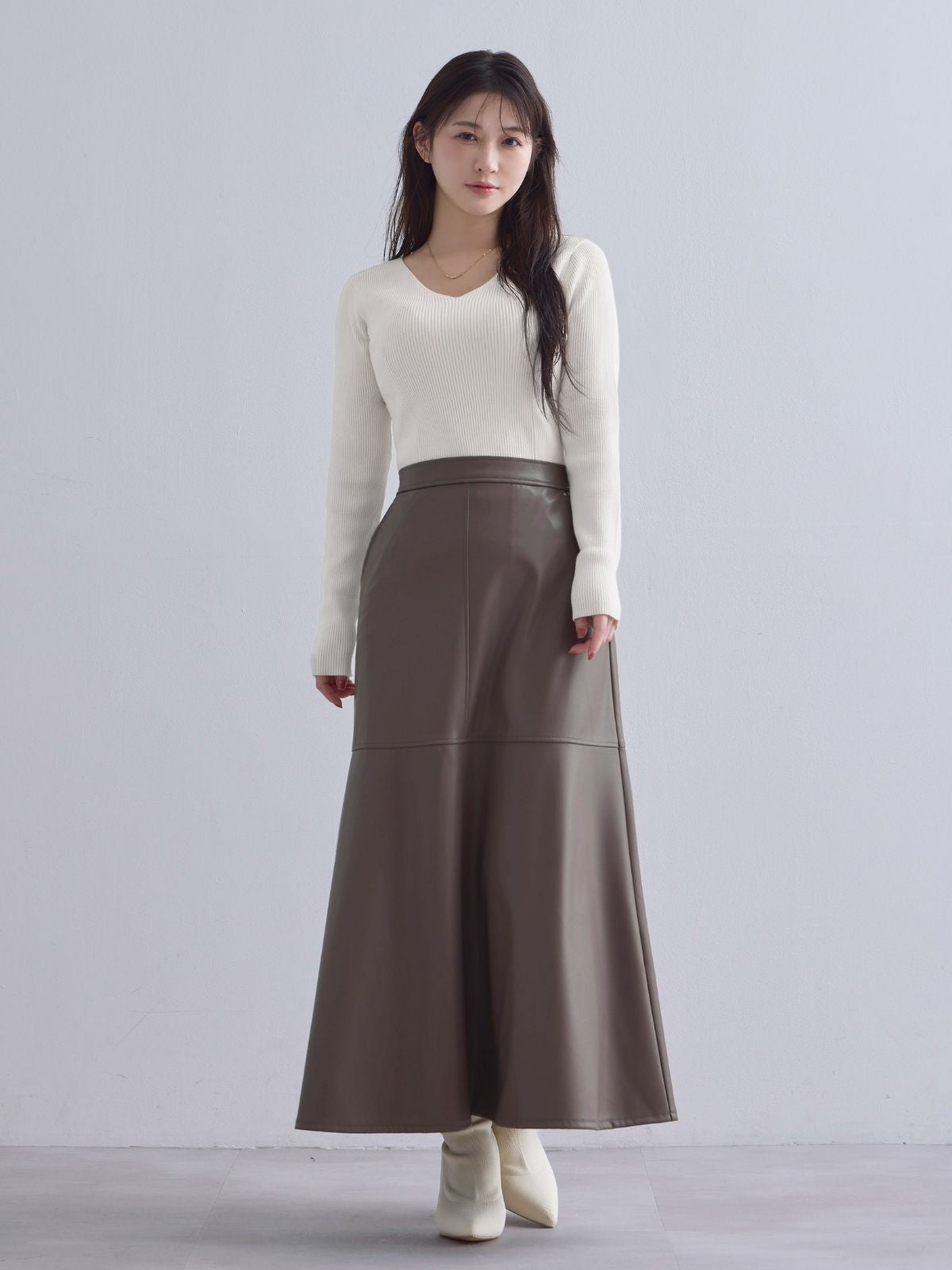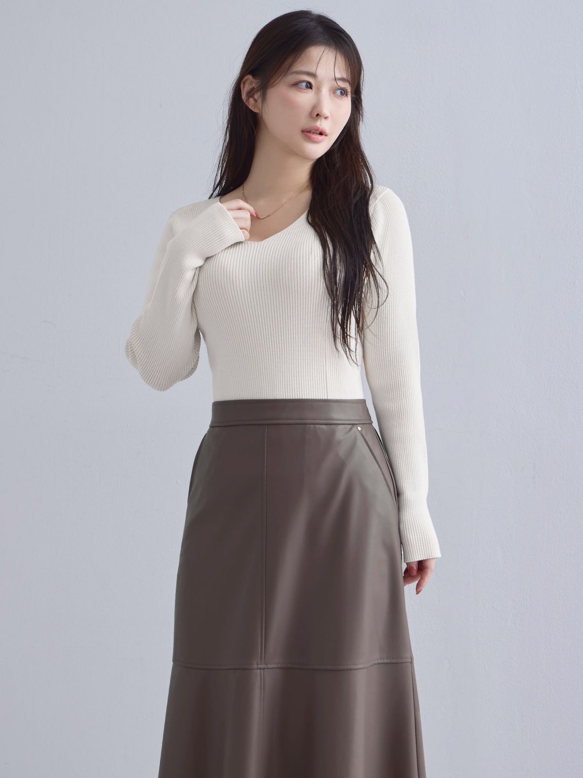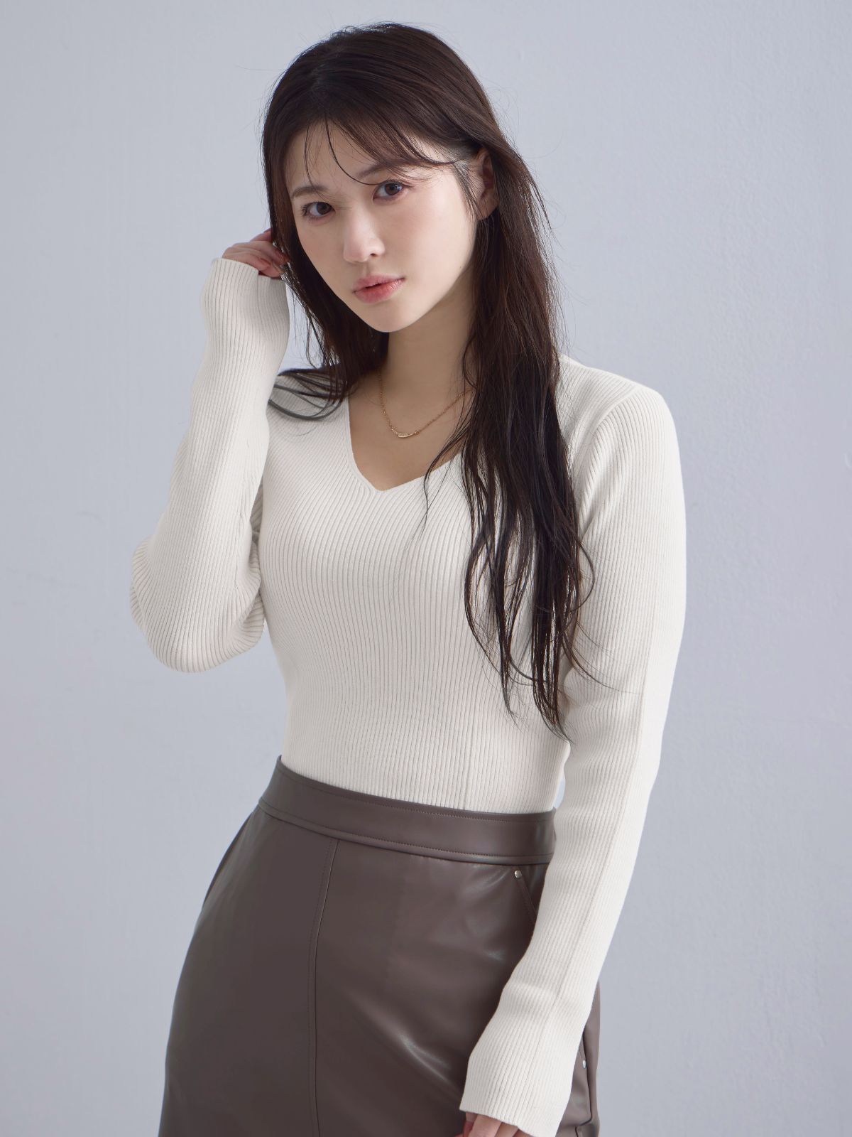 いつも気がつくと売り切れていて、今年初めて購入しましたがラインがすっきりしていて、首元の開きもちょうどいい具合でした。いつもかがむと見えてしまう谷間が見えない、何にでも合うニットです。今出ているもの以外(ラメ系やブラウン等)やUネックver.も欲しいです。