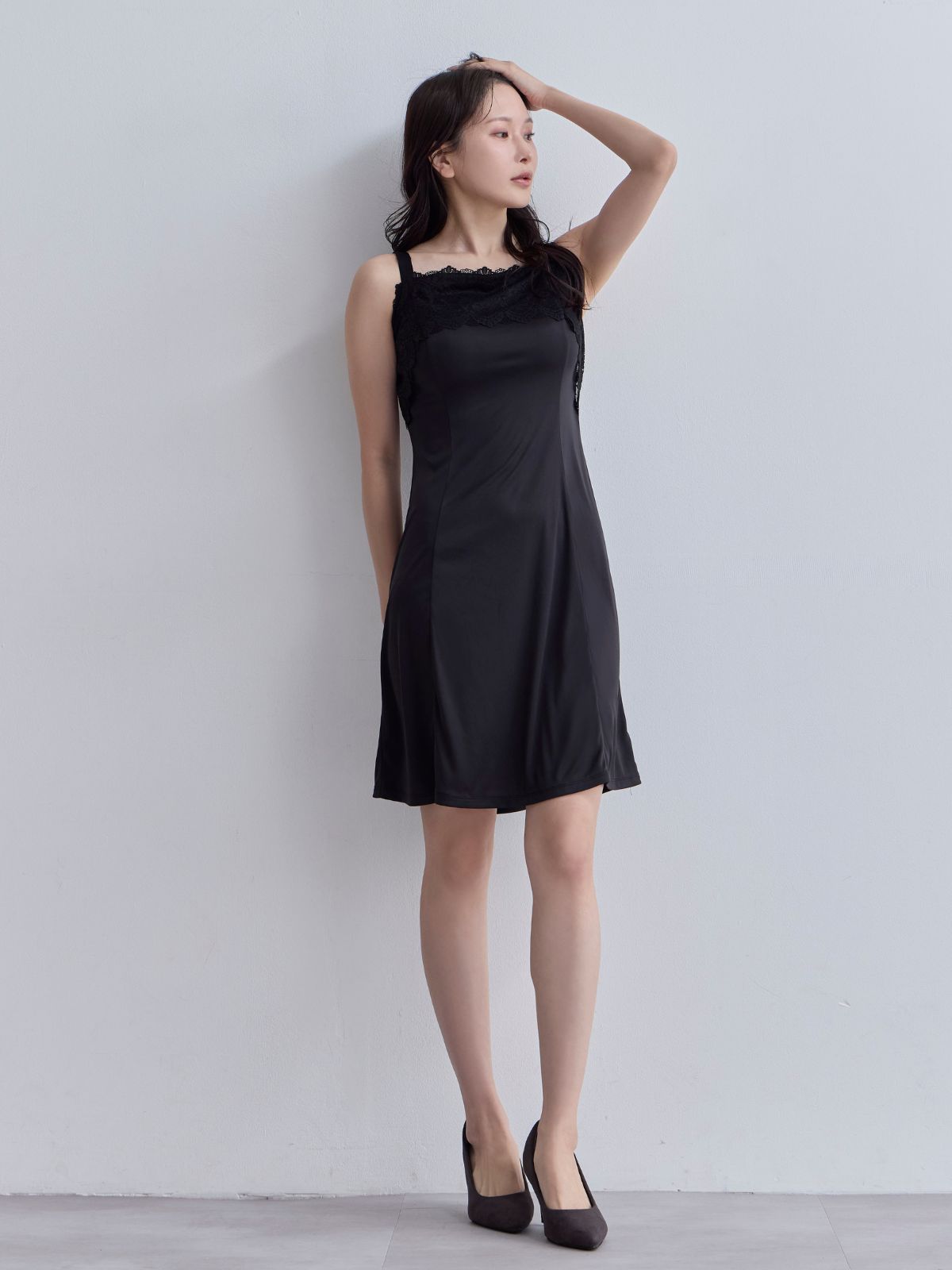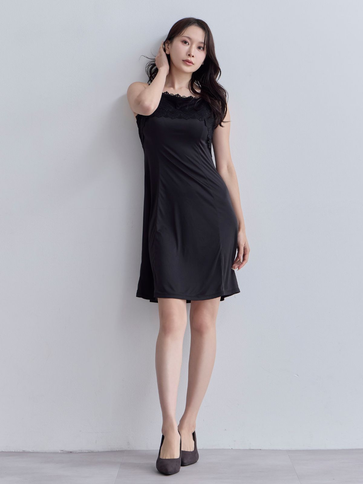 ブラ紐とまるレースキャミソールスリップ:ネイビー